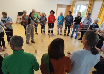 Am Sonntag nach dem Frühstück waren die HospizbegleiterInnen eingeladen im schönen alten Kino, im Ankersaal, den Film: "Diagnose Demenz - Ein Schrecken ohne Gespenst" anzuschauen. Eine Filmdoku über die sieben Demenz-Jahre einer Mutter. Von denen der Sohn und die Schwiegertochter sagen: "Es waren die intensivsten und schönsten Jahre unseres Lebens." Tief berührt mit vielen Gedanken ging man zurück ins Tagungshaus, um dort nach dem Mittagessen sich auf die Heimreise einzustimmen. Mit einer Abschlussrunde, wo viele ihre Dankbarkeit für diese gemeinsame intensive Zeit zum Ausdruck brachten, mit Klängen auf dem Monochord und berührendem Gesang, endete das diesjährige Fortbildungswochenende und man trat gemeinsam mit dem Bus die Heimfahrt an.