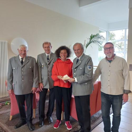Bild: v. l. n. rechts Ehrenvorstand KSK Gerhard Babl, Fähnrich KSK Josef Skala, 1. Vorsitzende Hospizverein Gertraud Ertl, 2. Vorstand der KSK Hubert Aschenbrenner und 2. Vorsitzender Hospizverein Jerry Valentin